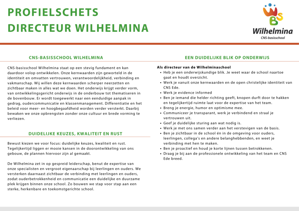 CNS-basisschool Wilhelmina zoekt een ervaren directeur (0,8 -1.0 fte). Iemand die met visie, verbinding en daadkracht onze school verder wil brengen en samen met het team de koers houdt in een tijd van ontwikkeling en groei.